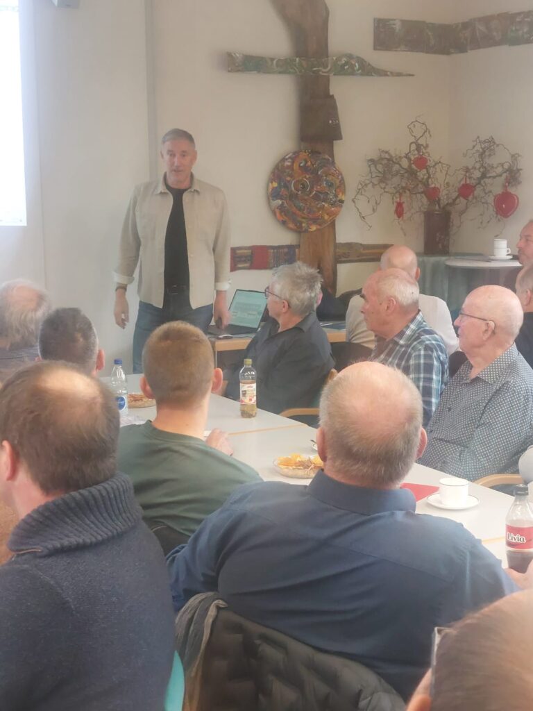 Das Thema „Dorfkernzone Sulz“ interessierte viele Einheimische, so dass die Tische in der KulturWerk-Stadt sehr gut besetzt waren. Hanspeter Weiss, Vorsitzender der Fördergruppe Dorfkernzone Sulz, präsentierte uns mit Unterstützung der zwei Mitglieder Dieter Deiss und Heinz Obrist viel Spannendes. Über die Idee eines Ruftaxis wurde ebenso diskutiert wie über die sich in Planung befindenden Neubauten in Bütz und auch über mögliche Umbauten in anderen Dorfteilen. Nach zwei interessanten Stunden bedankte sich Reto bei Hanspeter und seinem Team mit einem kleinen Präsent für die anregende Präsentation.