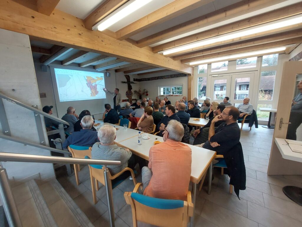 Das Thema „Dorfkernzone Sulz“ interessierte viele Einheimische, so dass die Tische in der KulturWerk-Stadt sehr gut besetzt waren. Hanspeter Weiss, Vorsitzender der Fördergruppe Dorfkernzone Sulz, präsentierte uns mit Unterstützung der zwei Mitglieder Dieter Deiss und Heinz Obrist viel Spannendes. Über die Idee eines Ruftaxis wurde ebenso diskutiert wie über die sich in Planung befindenden Neubauten in Bütz und auch über mögliche Umbauten in anderen Dorfteilen. Nach zwei interessanten Stunden bedankte sich Reto bei Hanspeter und seinem Team mit einem kleinen Präsent für die anregende Präsentation.
